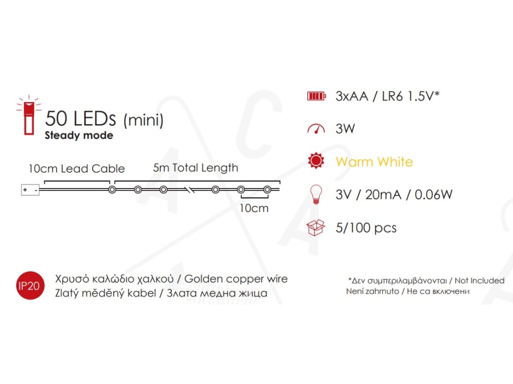 LED okrasna verižica 5m, 50 LED, 3xAA, WW, brez funkcij, zlata [X0150131]