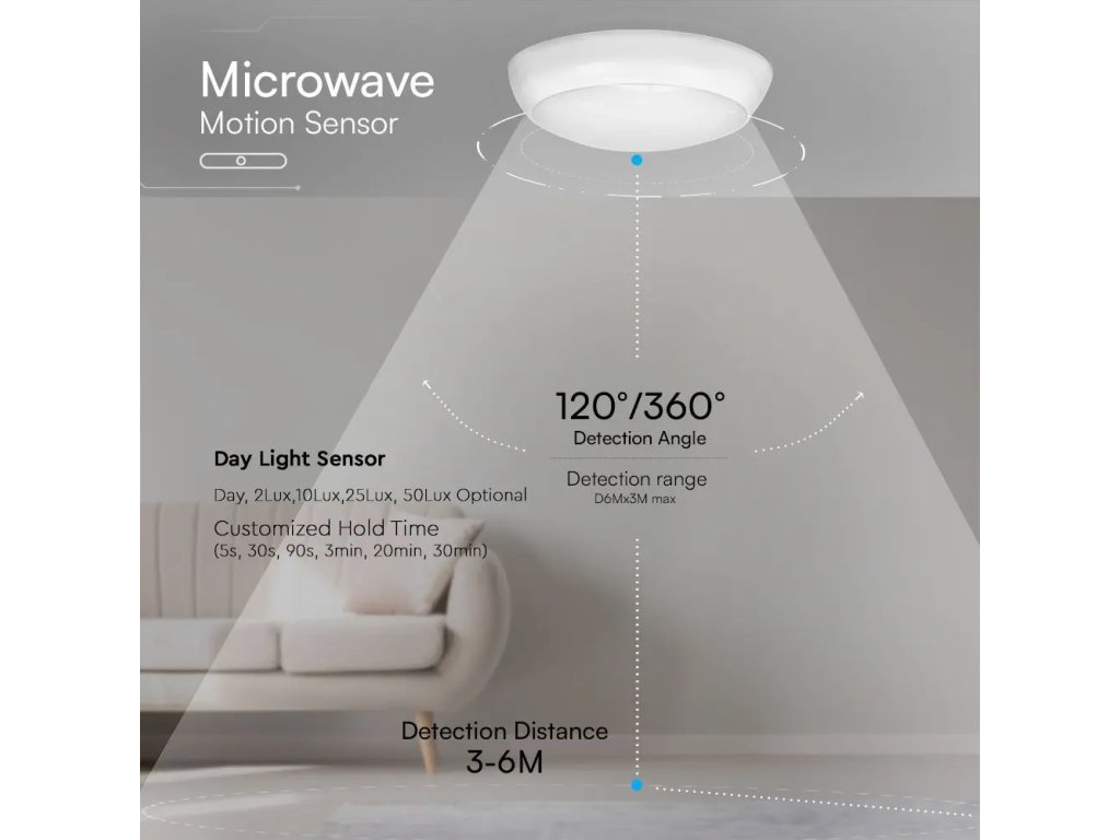 - Vgrajen visokofrekvenčni mikrovalovni senzor gibanja učinkovito zaznava gibanje tudi skozi ovire
