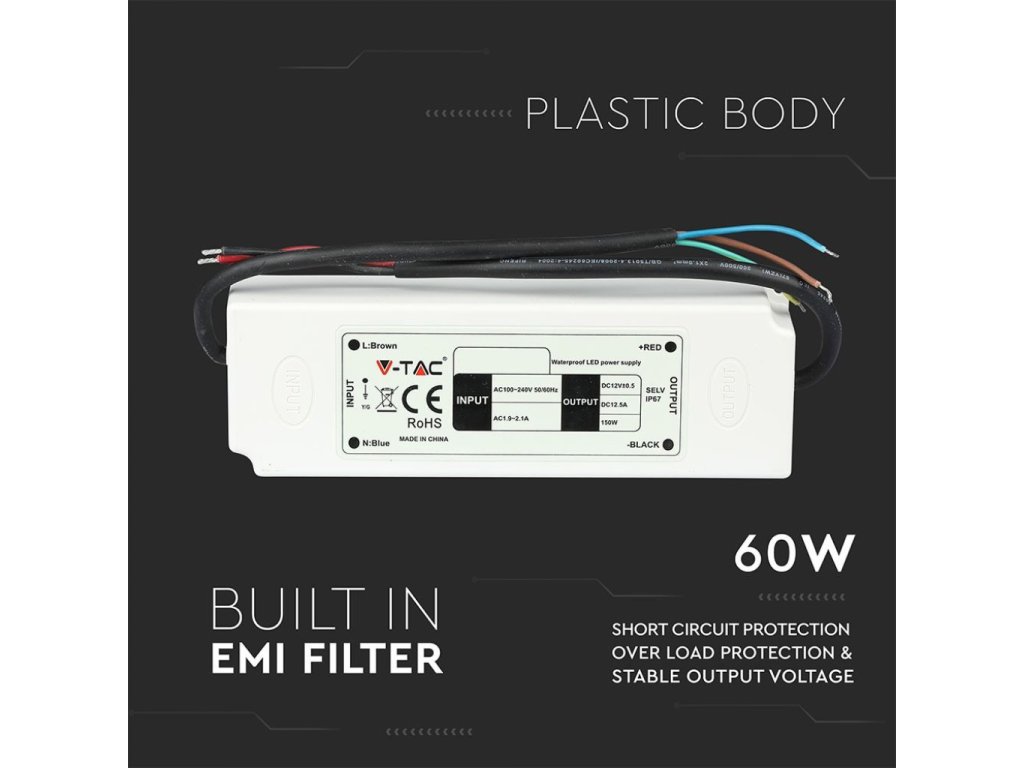 - Vgrajen EMI filter zmanjšuje elektromagnetne motnje in izboljšuje stabilnost napajanja