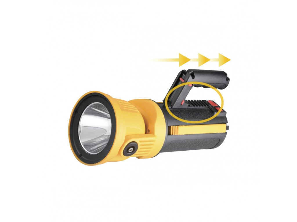 - Tri zložljive noge, vgrajene v podnožje svetilke, omogočajo stabilno postavitev na ravno površino, zaradi česar je odlična rešitev tako v delavnici kot med kampiranjem ali popravili.