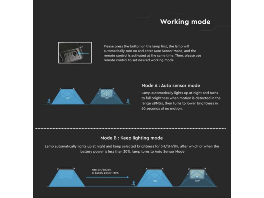 - Neprekinjena osvetlitev: LED reflektor se samodejno vklopi ponoči in ohranja izbrano svetlost 3 ure/5 ur/8 ur, po tem (oz. ko je napolnjenost baterije manj kot 30%) preklopi v samodejni senzorski način.