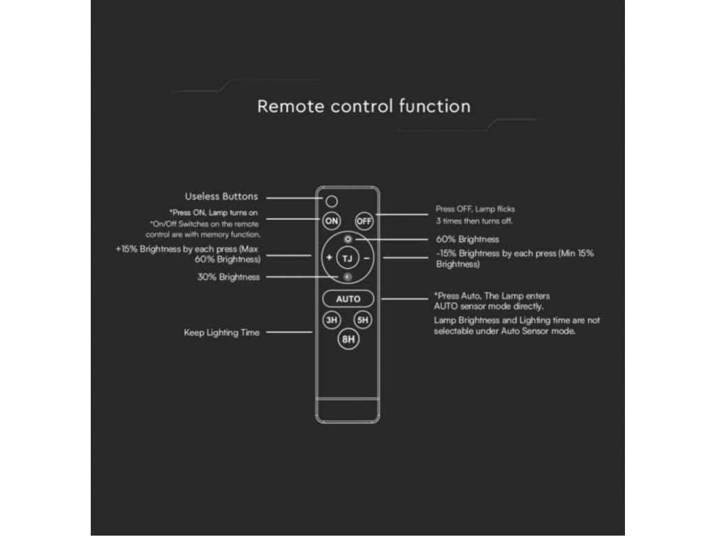 - Samodejni senzor: LED reflektor se bo samodejno vklopil ponoči, ko bo zaznano gibanje v radiju ≤8 metrov, se bo vklopil na največjo svetlost, po 60 sekundah, brez nadaljnjega zaznavanja gibanja, bo zmanjšal intenzivnost osvetlitve .